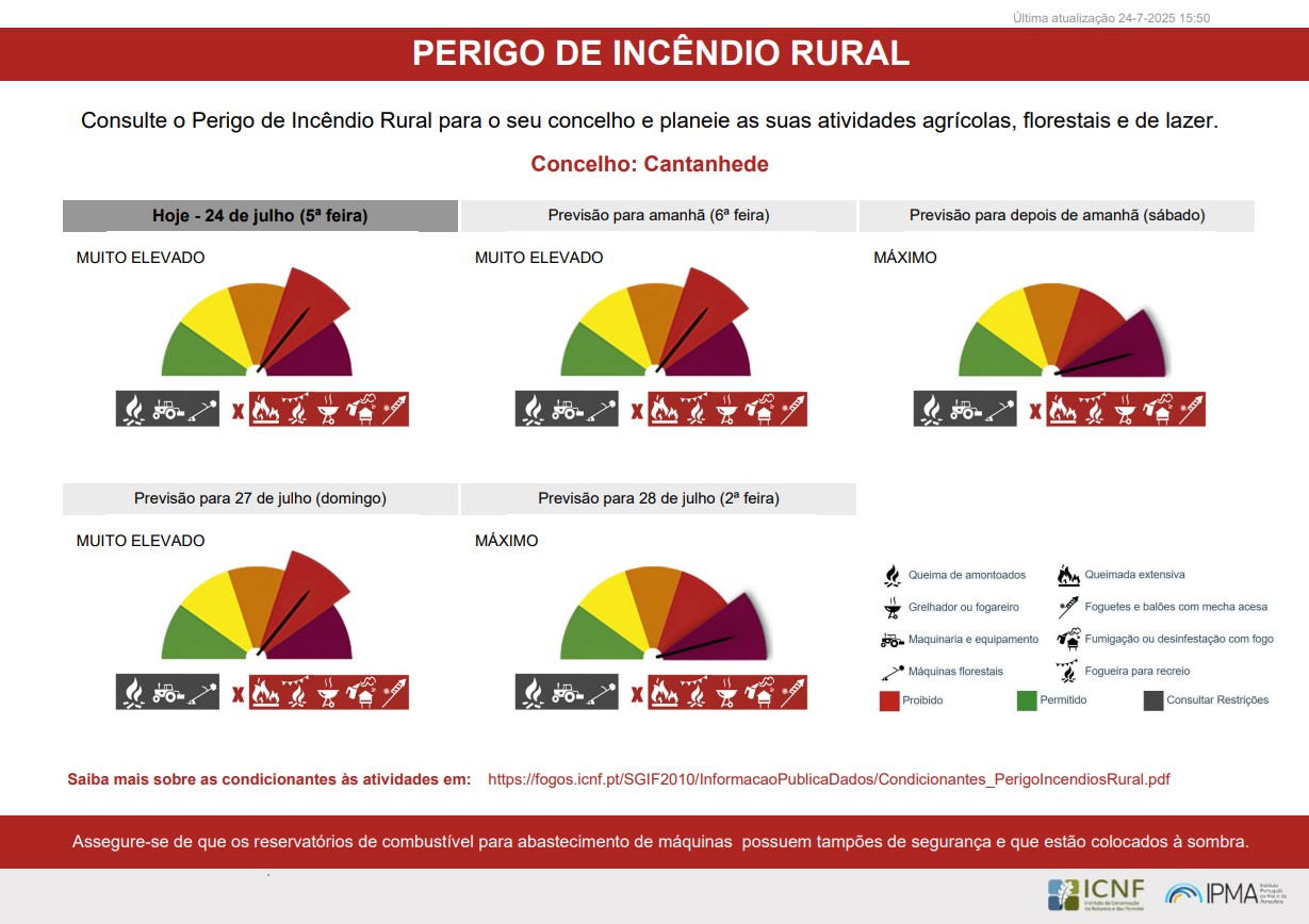 De acordo com informação disponibilizada pelo IPMA, entre os dias 24 e 31 de julho, o nível de Perigo de Incêndio Rural no Concelho de Cantanhede, é Muito Elevado e Máximo!